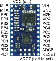 distancia digital, etc.. PB2: SS/OC1B/PCINT2. SS: slave select, para el protocolo SPI que no está disponible en esta placa. Sin uso. OC1B: output compare match output timer1. Igual que en el anterior. PCINT2: interrupción externa como los anteriores. PB4: MISO/PCINT4. MISO: master input slave output, señal del protocolo spi, sin uso ya que no está disponible en la placa. PCINT4: interrupción externa como en los casos anteriores.