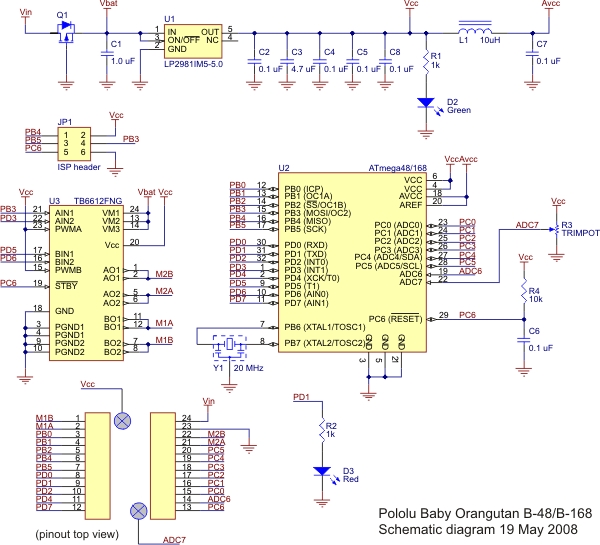 Baby Orangutan B-328 Robot Controller.Link. Como cerebro del robot y para el control de lo motores vamos a utilizar esta placa que vende pololu, su precio es de $30 ($42 con su programador)